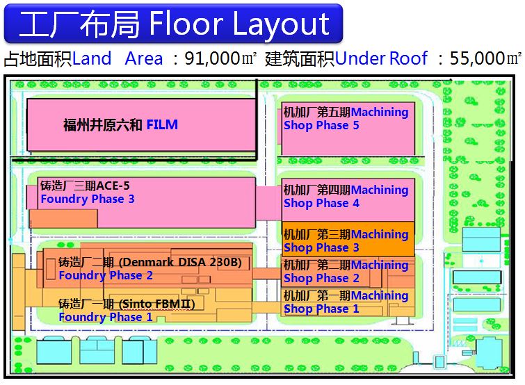 | 1.鑄造廠: 主要材質(zhì):灰口鑄鐵&球墨鑄鐵(FC150-FCD700部品、高硅高鉬等部品) 造模產(chǎn)線:3條(FBM&DISA&ACE) 產(chǎn)能合計(jì)5,100噸/月。熔解爐(中頻電爐):3T-8支/5T-4支 砂模尺寸:900*800*230-260(ACE-5),535*650*X(DISA,X指可調(diào)),420*520*150-180(FBM-II) 鑄件重量:0.2Kg-30Kg(Max:70Kg) |